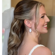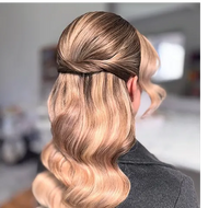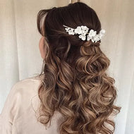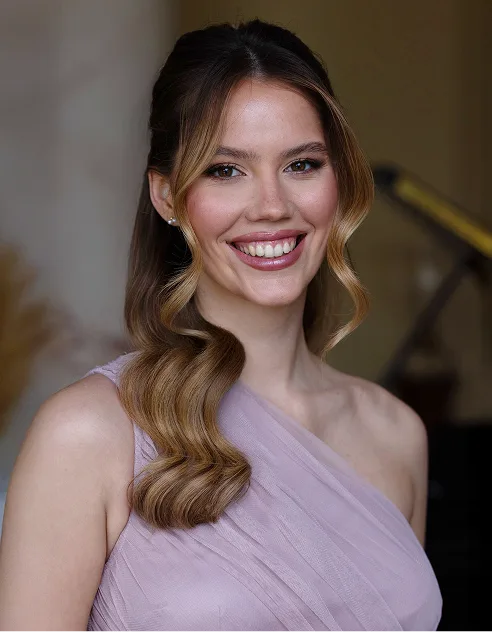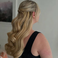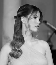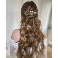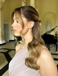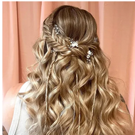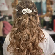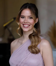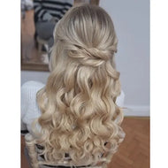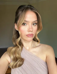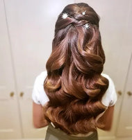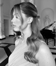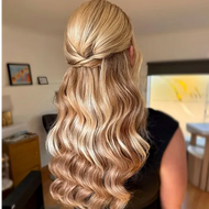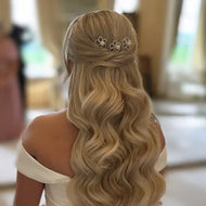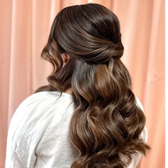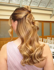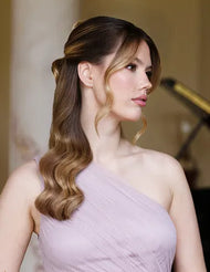 Sweet, romantic, and full of storybook magic. This half up half down style features relaxed waves flowing freely with elegant volume, while the top is loosely gathered and pinned at the back in an intricate twist for a dreamy, lifted look. Face-framing tendrils add movement and grace, complimenting soft blush tones and floral touches. Read More